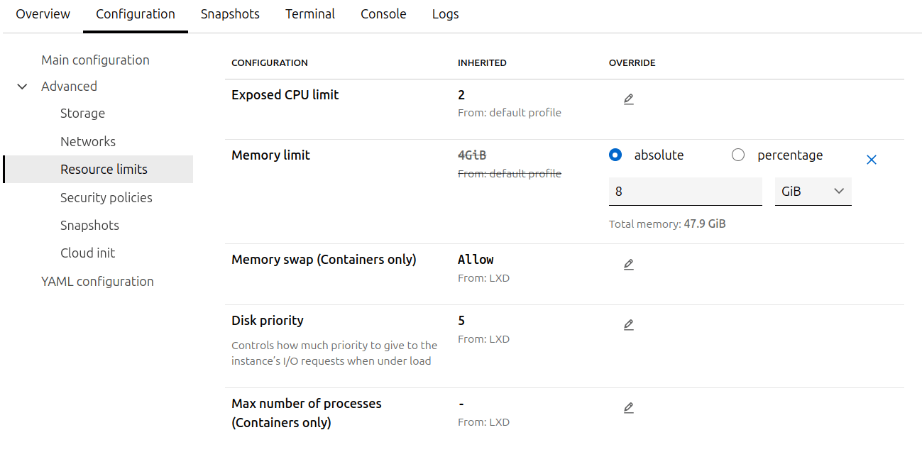 The LXD UI does not distinguish between instance options and instance properties. Therefore, you can configure instance properties in the same way as you configure instance options.