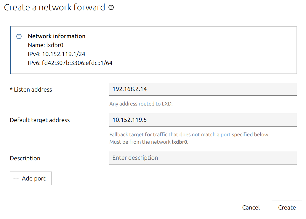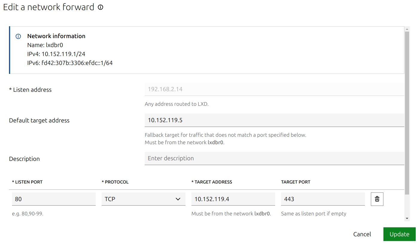In the web UI, you can configure port specifications on a network forward at the time you create the forward, or by editing the forward after creation.