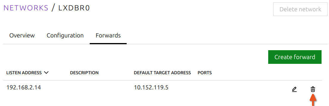 In the web UI, select Networks in the left sidebar, then select the desired network. On the resulting screen, view the Forwards tab. This tab shows you information about all forwards on the network. Click the Delete icon next to a forward to delete it: