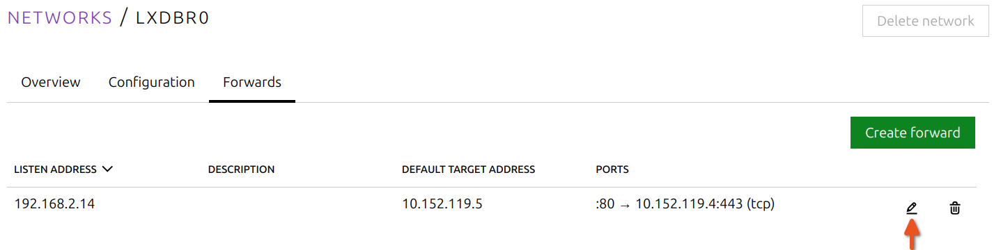 In the web UI, select Networks in the left sidebar, then select the desired network. On the resulting screen, view the Forwards tab. This tab shows you information about all forwards on the network. Click the Edit icon next to a forward to edit it: