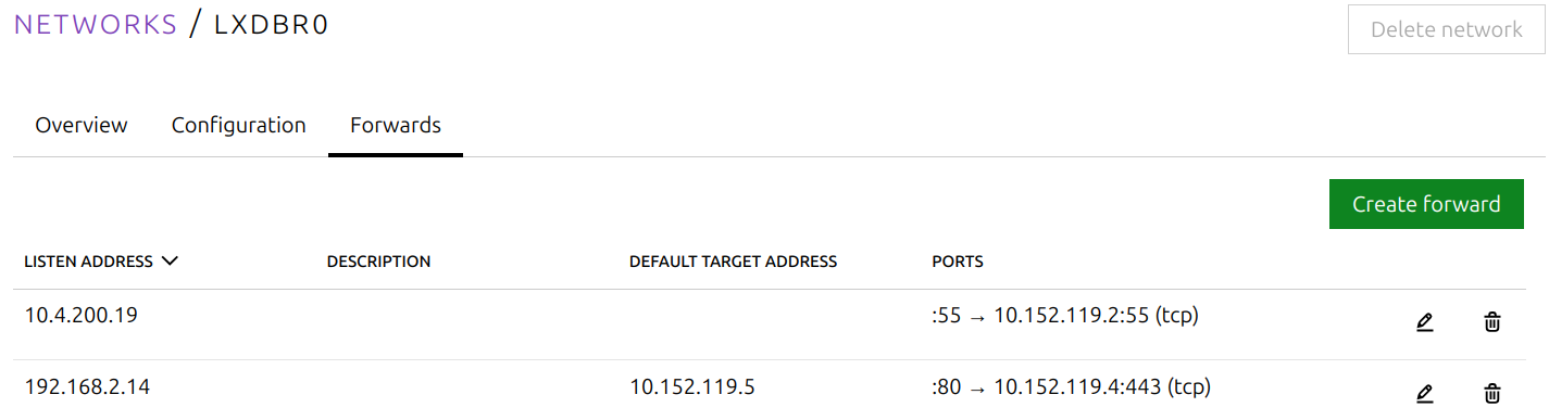 In the web UI, select Networks in the left sidebar, then select the desired network. On the resulting screen, view the Forwards tab. This tab shows you information about all forwards on the network. You can click the Edit icon to view details for a specific forward: