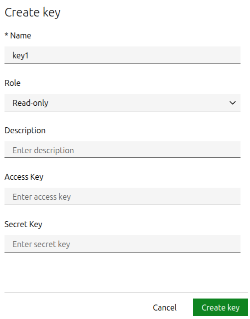 In the form that appears, set a unique name for the key. You can optionally configure the role, description of your storage bucket key.