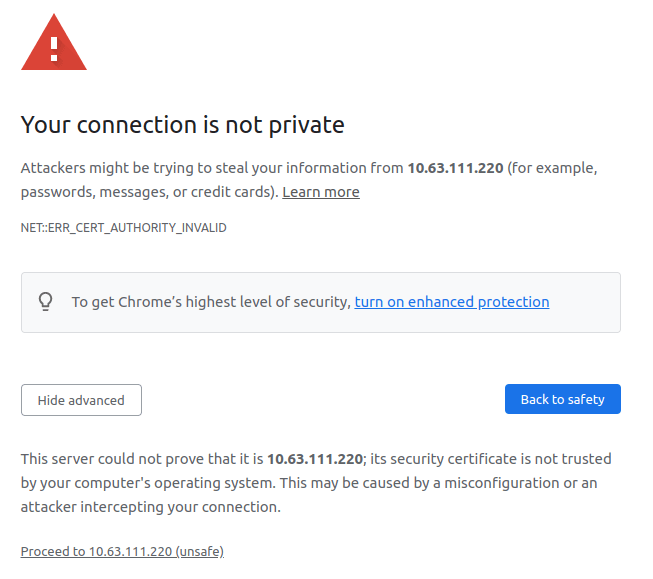 ).If you have not set up a secure TLS server certificate, LXD uses a self-signed certificate, which will cause a security warning in your browser. Use your browser’s mechanism to continue despite the security warning.