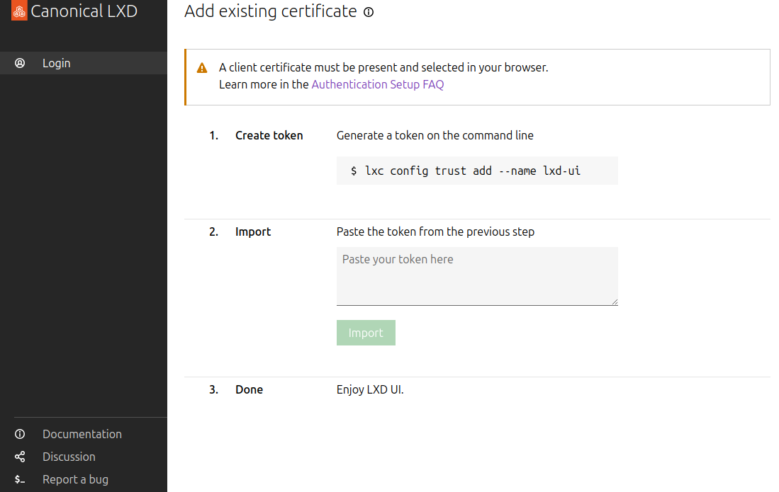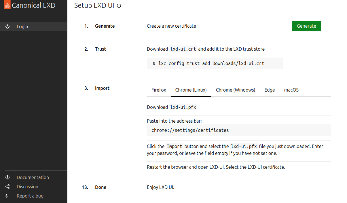Set up the certificates that are required for the UI client to authenticate with the LXD server by following the steps presented in the UI.